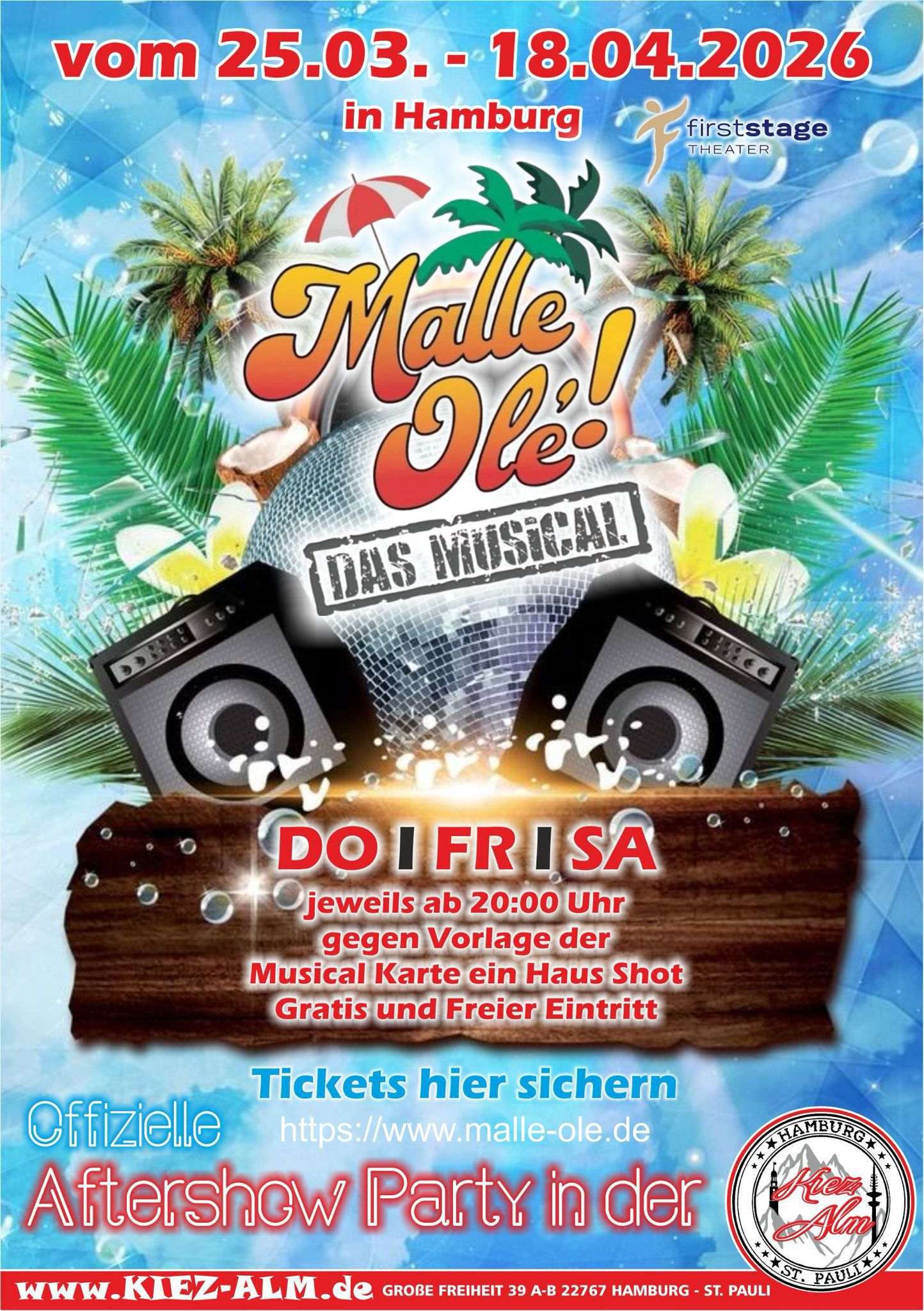 Nach der sensationellen Premiere und erfolgreichem Gastspiel im Duisburger Theater am Marientor will „Malle Olé“ jetzt auch Deutschlands Musical-Hauptstadt erobern und kommt für ein vierwöchiges Gastspiel ans First Stage Theater nach Hamburg. Vom 25. März bis zum 18. April bringt das energiegeladene Musical-Ereignis die Extra-Portion Partystimmung dorthin, wo das Herz des Musiktheaters schlägt, und sorgt für sommerlichen Ausnahmezustand in der Musical-Metropole.